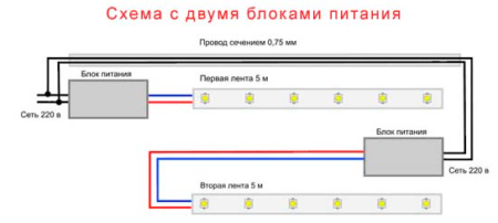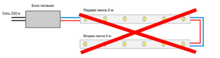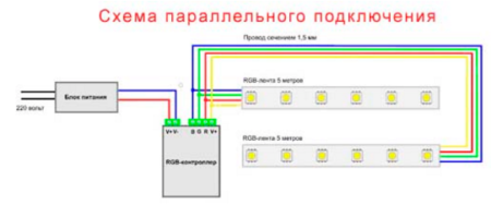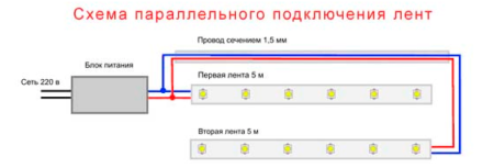 Из этой ситуации можно выйти при помощи параллельного соединения отрезков лент. Да, для этого понадобятся дополнительные соединительные провода сечения более 1 мм. Рассматриваемый тип соединения применяется в тех случаях, когда есть возможность спрятать мощный и массивный блок питания: