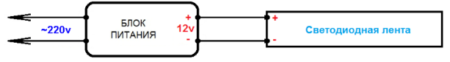 Для одноцветной (холодно-белой, белой, тёпло-белой, зеленой, синей, красной, жёлтой) светодиодной лены подсоединение выполняется по схеме: