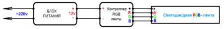 Обычная схема подключения RGB ленты такая: к низковольтному выходу блока питания подключается контроллер, соответственно к плюсу и минусу. А затем к контроллеру подключается светодиодная лента, к соответствующим клеммам. Здесь от контроллера к ленте идет 4 провода: 3 из них управляют цветами: синим (B), красным (R) и зеленым (G) цветом, а последний является общим питанием. К контроллеру RGB – ленты подаётся напряжение от блока питания. Сам контроллер имеет кнопки (регуляторы) для настройки параметров свечения светодиодной ленты. Схема подключения RGB-ленты представлена в виде: