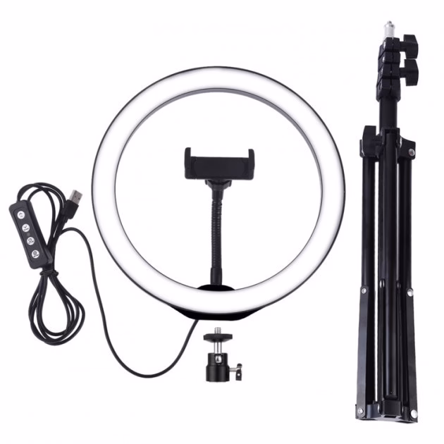 Кільцева світлодіодна поворотна лампа з тримачем під мобільний телефон 26 см у діаметрі має 3 режими свічення з регулюванням яскравості, які перемикаються на пульті управління: холодний білий, теплий жовтий та нейтральний денний. Лампа працює від USB, що дозволяє запитати її як від ПК, ноубтука, розетки, так і від повербанка або прикурювача автомобіля, взявши її з собою. Лампу можна нахиляти під будь-яким кутом. Лампа ідеально підходить для фото та відео зйомки, її часто використовують фотографи, блогери, стилісти, візажисти, перукарі, тату майстри, косметологи та інші майстри beauty індустрії. З її допомогою Ви зможете робити якісніший та привабливіший контент, рівномірне освітлення не створюватиме тіні та фотографії будуть максимально соковитими та яскравими, що допоможе Вам залучати більше клієнтів демонструючи свої роботи. Однією з відмінних характеристик цієї лампи є наявність утримувача під мобільний телефон, що дозволить Вам заощадити на покупці іншого штатива з кріпленням та забезпечить правильний розподіл світла на об’єкті зйомки щодо об’єктива камери. У комплект до лампи йде компактний та легкий студійний штатив для накамерних та студійних спалахів із софтбоксами та іншого освітлювального обладнання загальною вагою до 2,5 кг. Висота штатива регулюється від 0,85 м-коду до 2,10 м-коду. Конструкція штатива складається з трьох секцій, які фіксуються фіксаторами-кліпсами із пластику. Відмінна риса даної моделі – це мала вага (950гр) та компактний розміри – 72см у складеному стані. Штатив має зносостійке покриття, стійке до подряпин та відбитків пальців. Характеристики: Діаметр кільця: 26 см Потужність: 18 Вт Кількість режимів: 3 (теплий, природний, холодний) Яскравість лампи: 20-1000 LM Колірна температура холодного світла: 5500K Колірна температура теплого світла: 3000К Напруга: 5V Діапазон ABS, Акрил Живлення: від USB Довжина кабелю: 2 м Штатив йде в наборі