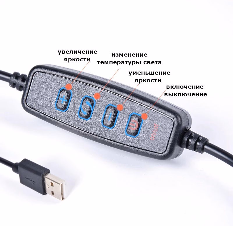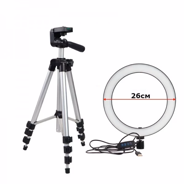 Кільцева LED лампа 26 см зі штативом 102см – виконана у вигляді алюмінієвого кільця зі штативом та тримачем для телефону, користується популярністю серед візажистів, дизайнерів, фотографів. Такому широкому спектру застосування лампа обручка зобов’язана своєму дизайну, завдяки якому виходить розсіяне і м’яке світло. Світлодіоди Як освітлювальний елемент штатив для телефону з лампою використовує 120 світлодіодів, розташованих у два ряди, живлення на які надходить від USB роз’єму. За допомогою пульта реалізовано керування вибору температури світла та яскравості. Зміна температура доступна між 3200, 5500К або змішаним режимом, коли один ряд має тепле світло, а інший холодне. Штатив Для зручного розташування та підбору правильного кута освітлення при застосуванні кільцевої лампи для телефону використовується трипод. Дана модель виготовлена з алюмінію і має чотири секційний дизайн: основна секція з якої висуваються по дві на кожній ніжці і центральна з кріпильною головкою, що висувається вгору. Такий тип регулювання дозволяє встановити штатив на будь-якій нерівній поверхні. За надійну фіксацію висоти в межах 32-102см відповідають швидкозатискні клямки. Кріпильна головка має механізм із регулюванням повороту на 360° вздовж горизонту, нахилу 180°. Кріплення Кільцева лампа обладнано шарнірною головкою, що дозволяє вільно змінювати положення як нахилу, так і повороту. Може бути закріплена на штатив, монопод або будь-який інший тримач зі стандартним різьбленням 1/4 дюйма. Характеристики: Діаметр кільця: 26 см Потужність: 12 Вт 3 режими свічення: природний білий, теплий білий і середнє між ними свічення 11 рівнів яскравості USB, довжина кабелю ~2 м Різьблення 1/4″ для встановлення лампи на штатив Матеріал корпусу: алюмінієвий сплав Вага: 265 г