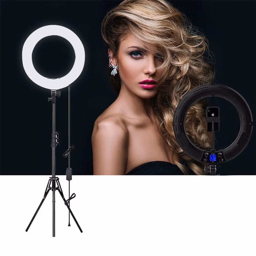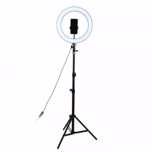 Кільцева світлодіодна поворотна лампа з тримачем під мобільний телефон 26 см у діаметрі має 3 режими свічення з регулюванням яскравості, які перемикаються на пульті управління: холодний білий, теплий жовтий та нейтральний денний. Лампа працює від USB, що дозволяє запитати її як від ПК, ноубтука, розетки, так і від повербанка або прикурювача автомобіля, взявши її з собою. Лампу можна нахиляти під будь-яким кутом. Лампа ідеально підходить для фото та відео зйомки, її часто використовують фотографи, блогери, стилісти, візажисти, перукарі, тату майстри, косметологи та інші майстри beauty індустрії. З її допомогою Ви зможете робити якісніший та привабливіший контент, рівномірне освітлення не створюватиме тіні та фотографії будуть максимально соковитими та яскравими, що допоможе Вам залучати більше клієнтів демонструючи свої роботи. Однією з відмінних характеристик цієї лампи є наявність утримувача під мобільний телефон, що дозволить Вам заощадити на покупці іншого штатива з кріпленням та забезпечить правильний розподіл світла на об’єкті зйомки щодо об’єктива камери. У комплект до лампи йде компактний та легкий студійний штатив для накамерних та студійних спалахів із софтбоксами та іншого освітлювального обладнання загальною вагою до 2,5 кг. Висота штатива регулюється від 0,85 м-коду до 2,10 м-коду. Конструкція штатива складається з трьох секцій, які фіксуються фіксаторами-кліпсами із пластику. Відмінна риса даної моделі – це мала вага (950гр) та компактний розміри – 72см у складеному стані. Штатив має зносостійке покриття, стійке до подряпин та відбитків пальців. Характеристики: Діаметр кільця: 26 см Потужність: 18 Вт Кількість режимів: 3 (теплий, природний, холодний) Яскравість лампи: 20-1000 LM Колірна температура холодного світла: 5500K Колірна температура теплого світла: 3000К Напруга: 5V Діапазон ABS, Акрил Живлення: від USB Довжина кабелю: 2 м Штатив йде в наборі Нижче фото найпопулярніших ламп