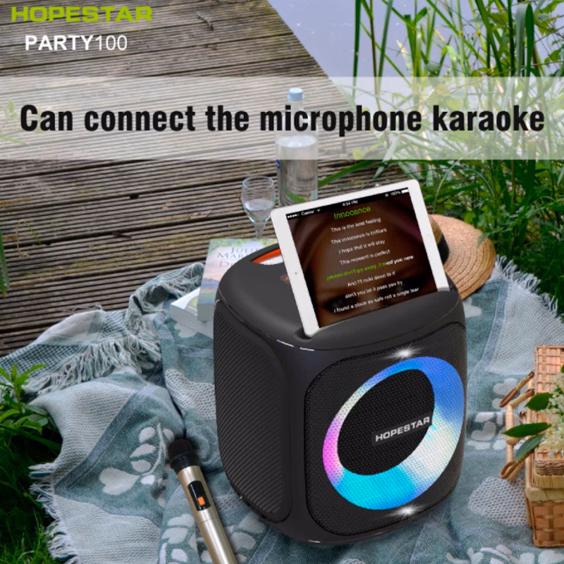 Колонка Hopestar Party 100 Портативна Велика 55 Ватт – Новинка. Топ продажів. У разі виникнення запитань просимо Вас дзвонити по телефону на сайті. Відомий бренд Hopestar Party 100 представляє новинку 2021 року, Портативна колонка Hopestar party 100 з бездротовим радіомікрофоном для караоке. Колонка відрізняється унікальним та стильним дизайном у формі барила, вологозахисним корпусом, зручною ручкою для транспортування. Зверху розташовується панель керування режимами та підставка для смартфона, на дні колонки знаходиться пасивний випромінювач, завдяки чому звук набуває більш насиченого відтінку з виразними басами. Спереду колонки за декоративними ґратами розташований потужний широкосмуговий динамік діаметром 6 дюймів зі світлодіодним підсвічуванням. Характеристики: Стандарт бездротового зв’язку: 5.0 Дальність передачі: 10 метрів Вихідна потужність: 50 Вт Час гри: 10 годин Частотний ефект: 100 Гц ~ 10 кГц Динамік: 135 мм, 4 Ом 50 Вт Вхідна потужність: DC5V, 500 мА Максимальне 18650 літій-іонний 10000 мАг Інтерфейс введення аудіосигналу: стандартний роз’єм для навушників Φ3,5 мм (стерео) Особливості: Бездротове з’єднання Підтримка TF-картки / режиму відтворення AUX Вбудована літієва батарея. Функція гучного зв’язку Підтримка декодування музичних форматів MP3/WAV/WMA/FLAC/APE Використовуйте високоякісні динаміки, зробіть звук більш природним та ніжним. Послідовна функція 1+1 Водонепроникність IPX7. Функція FM Комплектація: Портативна колонка Hopestar Original Party 100; Мікрофон Фірмова Упаковка; Кабель для заряджання; AUX кабель.