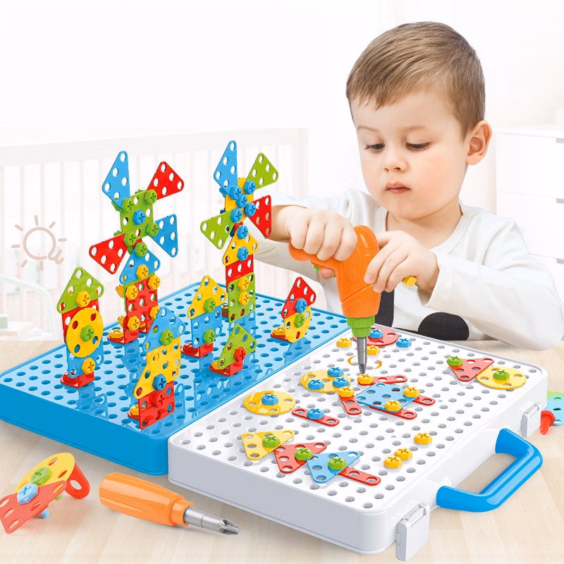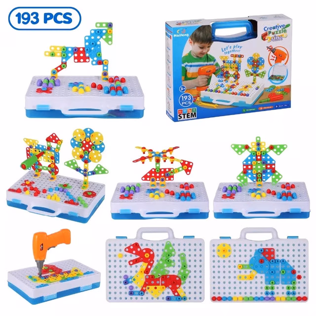 Думаєте, чим ще здивувати дитину, чим допомогти їй у розвитку талантів? Хочеться, щоб іграшка була і цікава, і корисна? Чудовий конструктор у валізці Creative Puzzle 4 в 1 – те, що потрібно малюку! Конструктор Creative Puzzle 4 в 1 допоможе реалізувати і художні завдатки, і навички конструювання, і здатність до механіки! А також розвине логіку, дрібну моторику, координацію, уяву, працьовитість, навички майстерності та конструювання. Опис: Валіза для зберігання деталей легко перетворюється на панель для мозаїки. Якщо карапузу хочеться щось будувати, він тягнеться до татових інструментів, виявляє інтерес до конструювання або йому набридло просто малювати подаруйте йому цей унікальний набір. Хлопчикам він точно припаде до душі: синочок зможе реалізувати всю свою фантазію за допомогою спеціальних різнокольорових деталей та дриля. Ці яскраві детальки він зможе в будь-якому порядку, в якому йому тільки підкаже уяву, розкладати на звороті валізки — дошці. А спеціальним дрилем прикручувати їх, щоб закріпити та помилуватися на результат. До складу набору входить: – 100 шурупів жовтого, зеленого, синього та червоного кольорів; – 16 гайок; – 64 елементи мозаїки (кола, квадрати, трикутники, прямокутники); 4-х кольорів; Шуруповерт працює від 2-х батарейок 1.5V AA – 1 викрутка – 6 з’єднувачів – 1 валізка для зберігання всіх деталей мозаїки – 1 інструкція з 40 завданнями – 1 картонна упаковка Характеристики: Тип живлення шуруповерта: батарейки АА Кількість деталей: 193 шт Матеріал: