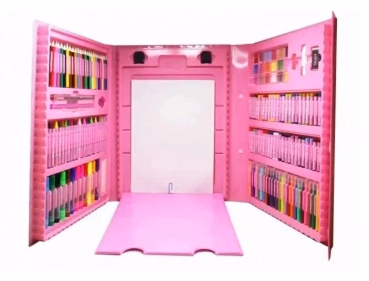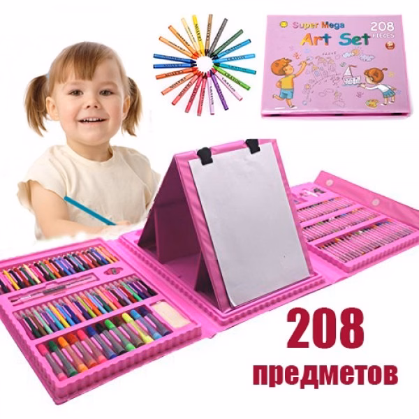 Набір для дитячої творчості у валізі з 208 предметів. Кожен предмет складний у свій осередок, а це означає, що все буде під рукою і ніколи не загубиться. Кейс розкладається просто, як книга Дитячий набір для малювання на 208 предметів – чудовий подарунок для дитини. Набір для малювання у валізці 208 предметів подарує Вашій дитині море позитивних емоцій. Любов до різноманітних аксесуарів для малювання, розфарбовування та відображення власних фантазій на папері, проявляється у всіх дітей, починаючи з наймолодшого віку. Валіза у вигляді металевого кейсу продумано до дрібниць. Він має висувні полички, які зберігають у собі все необхідне для маленького художника. Кожен предмет складний у свій осередок, а це означає, що все буде під рукою і ніколи не загубиться. У складеному вигляді кейс нагадує валізку, яку легко можна використовувати як вдома, так і в дорозі. Кейс розкладається просто як книга. Компактна валізка перетворюється на повноцінне зручне робоче місце юного художника. Валіза для малювання зручно зберігати і брати із собою. Переваги: Привчає до акуратності та дисципліни, покращує дрібну моторику рук, тренує уважність Легко використовувати та зберігати; Суттєва економія при купівлі набору порівняно з придбанням товарів окремо. Підготовка руки до письма; Поліпшує дрібну моторику рук; Тренує уважність; Набір юного художника для дитячої творчості стане чудовим подарунком для дітей; Характеристики: Призначення: набір для творчості; Вага: 2.2 кг Комплектація: 208 предметів Колір: Рожевий, блакитний Комплектація: 12 товстих фломастерів; 24 тонких фломастерів; 48 пастель олійна; 24 кольорові крейди; 24 кольорові олівці; 18 акварельних фарб; 15 аркушів для малювання; 30 скріпок; 4 затискачі для мольберта; 1 простий олівець; 1 гумка; 1 точила; 1 палітра; 1 клей; 1 лінійка; 1 пензлик; 1 губка; 1 мольберт для малювання.