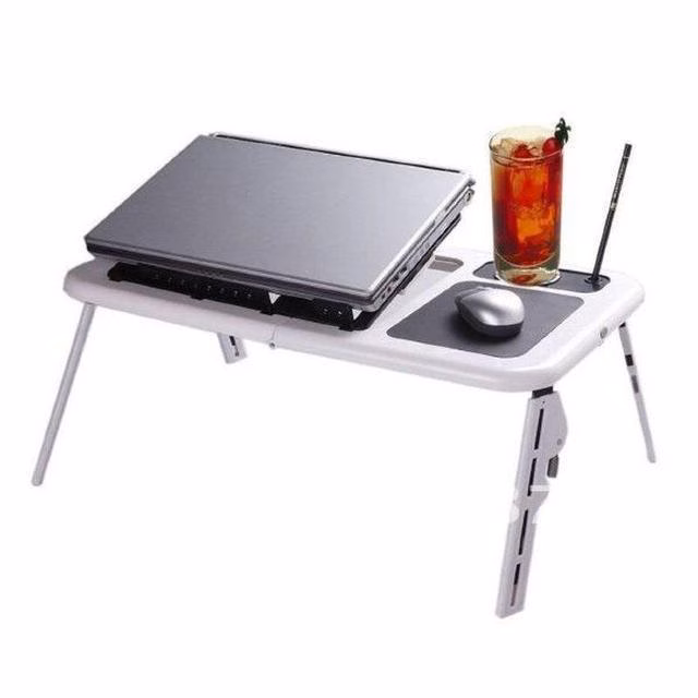 Столик-підставка для ноутбука E-Table (LD09) Практично кожна сучасна людина має у своєму розпорядженні персональний комп’ютер, а в більшості випадків ноутбук. Ця техніка допомагає нам працювати, грати, дізнаватися ази комп’ютерних систем, навчатися тощо. І коли ми вирішуємо вчинити якісь дії з ним, хочеться відчувати при цьому комфортно. У цьому нам допоможе багатофункціональний, комфортний та оригінальний столик E-Table, який можна використовувати не тільки у вигляді підставки для ноутбука, але й для книги, навіть сніданок у ліжко на ньому можна піднести. Монітор розташований досить високо, при тривалій роботі не затікає шия. Легко працювати із клавіатурою. Немає проблем з вентиляцією комп’ютера, тому що в ньому вбудовані 2 вентилятори, які працюють від ноутбука через вхід USB. Також продумана нерегульована підставка під пахву, що дуже зручно – мишка знаходиться у горизонтальному положенні. У складеному вигляді стіл дуже компактний, легко можна знайти місце для його зберігання. Характеристики : Максимальна діагональ ноутбука : 15,6″ Охолодження : Активне Матеріал : Пластик Колір : Чорно білий Вентилятори : 2 вентилятори, які працюють від ноутбука через USB вхід. Живлення : Від порту USB Додаткові характеристики : Сумісність з 10″ до 15,6 Macbooks, Ігрові консолі. Однак цілком поміщається 17» ноутбук. Поглиблення для чашки або телефону.
