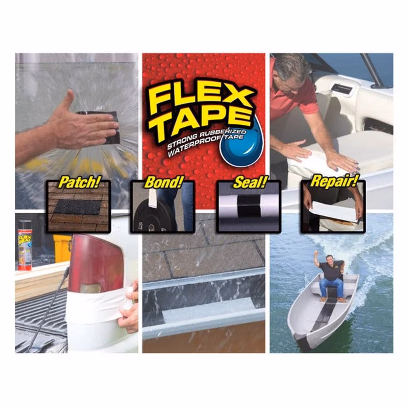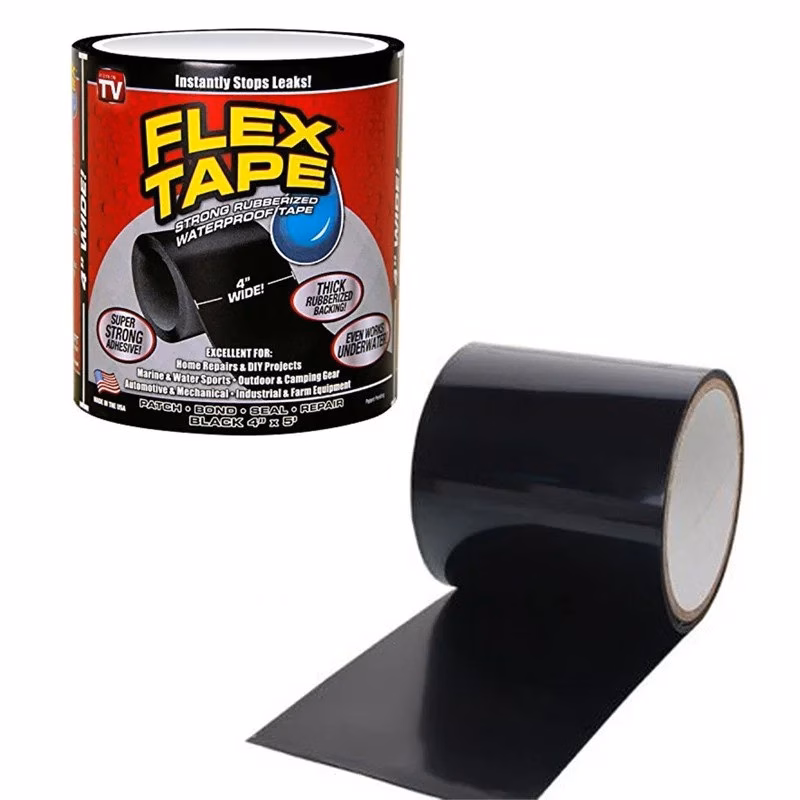 Міцна прогумована водонепроникна стрічка миттєво приклеюється до будь-якої поверхні. Flex Tape не боїться води – вона надійно склеює предмети навіть під водою завдяки потрійній товстій кулі клею, яка практично зварюється на більшості поверхонь. Відмінно підходить для швидкого ремонту витоків даху, водостічних жолобів, човнів, каное, зовнішнього та кемпінгового обладнання, ПВХ сантехнічних труб, басейнів, повітроводів тощо. буд. Переваги FlexTape: Дуже міцна, витримує до 50 кг вантажу. Підійде для надувних виробів і басейнів. Можна використовувати на ПВХ, акрил, метал, сталь, мідь, алюміній, кераміка, скло, гума, скловолокно, суха стіна, цемент та багато іншого. Переваги Flex Tape: Не боїться перепадів температури, можна використовувати на вулиці, так і в приміщенні; Миттєво спрацьовує; Водонепроникна; Можна використовувати на будь-яких поверхнях; Не боїться сонячних променів; Чи не токсична і не небезпечна. Характеристики: Матеріал: водонепроникний Ширина стрічки: 18 см Довжина: 150 см Товщина: 0.5 мм Діапазон робочих температур стрічки – від -45 до +85 градусів. Опір проникненню вологості µ>10000. Коефіцієнт теплопровідності 0,033 Вт/(м·K). Щільність 60-65 кг/м3. Має звукоізоляційні властивості. Має віброізоляційні властивості. Стійка до корозії. Витримує тиск до 50 кг Клейова частина: одностороння